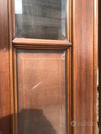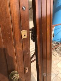 Vendesi portone in legno massello composta da tre ante apribili, con una vetrata superiore e una laterale. Completo di controcassa e di serratura blindata. Ottimo stato per ambienti stile rustico. Come si puo vedere dalle foto, i vetri sono stati lavorati ( bisellati ) che quasi piu nessun vetraio fa. I vetri dell’anta laterare sono stati parzialmente oscurati con un pannello in legno rimovibile. per avere una maggiore privacy. Si puo anche applicare una pellicola adesiva ghiacciata che lascia passare luce senza poter vedere allinterno… Misure: larghezza totale controcassa 139 x h 278 Vetrata superiore 133 x h 66 Anta principale 65 x h 212 Anta piccola 23,5 x h 212 Anta con vetri 46 x h 212