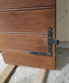 Doppia anta, liscia interno e maschiettato esterno, color noce e accessori in ferro battuto.