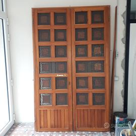 Portone ingresso in legno a due ante con inserti in vetro ondulato e decori in ferro battuto; misura totale larghezza cm 144 (nr 2 ante da 72 cm) e altezza cm 240. Serratura elettrica