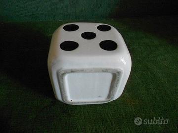 posacenere in ceramica bianca a forma di dado, vintage anni 90, perfetto, chiusura rotante a pressione. Misura cm 9 x 9 circa il dado e altezza totale cm. 16