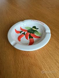 Portacenere vintage in ceramica smaltata fatta a mano, decorato con peperoncini calabresi rossi e foglie verdi, emblema del piccante tipico della Calabria. Iscrizione “Calabria” in rosso sul bordo, design artigianale calabrese con motivi floreali vivaci e supporto per sigaretta integra.