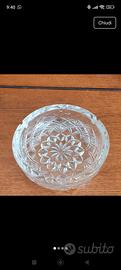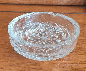 Elegante posacenere in vetro trasparente finemente lavorato con motivo decorativo inciso.