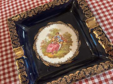 Elegante posacenere quadrato in pregiata porcellana di Limoges Castel (Francia). Colore blu cobalto intenso con decorazioni in oro zecchino 22k. • Soggetto: Scena galante stile "Fragonard" al centro. • Dettagli: Bordi floreali e poggia-sigarette rifiniti in oro. • Condizioni: Ottime, colori vivaci e dorature ben conservate. • Marchio: Originale Limoges Castel sul retro. • Dimensioni: 15x15 cm Perfetto per collezionisti o come raffinato complemento d'arredo.