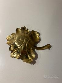 Raffinato piattino decorativo in ottone massiccio, modellato a forma di foglia di vite (o di fico) con nervature in rilievo e bordo morbido e sinuoso.