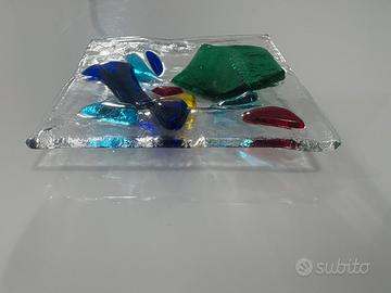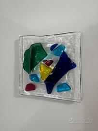 Splendido piccolo posacenere (o svuotatasche) in autentico vetro di Murano, realizzato con l'affascinante tecnica della vetrofusione. Il pezzo presenta un design moderno in stile "Arlecchino", con inserti geometrici di vetro colorato (blu, verde, giallo, rosso e azzurro) fusi su una base di vetro trasparente craquelé. La lavorazione artigianale rende ogni pezzo unico nei suoi riflessi. Dettagli dell'oggetto: • Materiale: Vetro artistico di Murano. • Dimensioni: L 8 cm x L 8 cm. • Condizioni: Ottime, come da foto. Non presenta sbeccature o crepe. • Stile: Vintage / Mid-Century Modern. • Utilizzo: Perfetto come elemento decorativo, piccolo svuotatasche da scrivania o idea regalo raffinata.