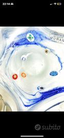 Elegante posacenere in vetro artistico di Murano, realizzato a mano secondo la tradizione dei maestri vetrai veneziani. Il pezzo presenta una forma organica a quattro punte morbide, con bordo trasparente e corpo interno decorato da murrine policrome fuse in un suggestivo vortice di tonalità blu e bianco latte.