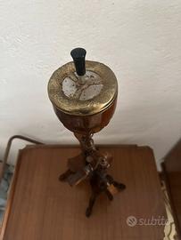 Vendo posacenere vintage da terra in legno, con struttura decorativa e contenitore superiore completo di meccanismo manuale.