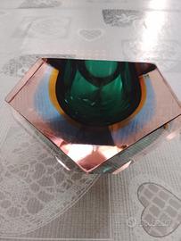 Posacenere vintage in vetro di Murano, anni 60/70 disegnato da Flavio Poli e realizzato con la tecnica sommerso, si presenta con delle forme sfaccettate e i suoi colori davvero unici e vivaci lo rendono un oggetto unico e di grande effetto.