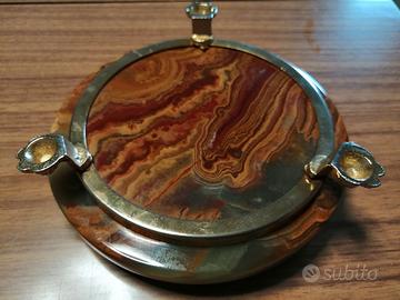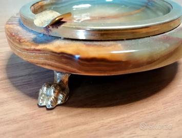 Posacenere Vintage in Onice lavorato e bordo dorato in Ottone con tre piedi a leone.