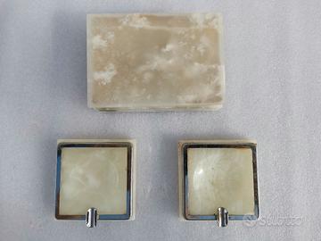 Trittico vintage in pietra onice formato da 2 portacenere ed un contenitore per sigarette.