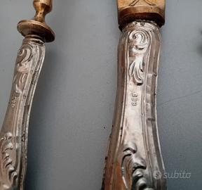Vendo set di posate d'epoca, che include coltello, mestolo e paletta per dolci. Sono in parte in ottone e in parte in argento, i manici sono in argento 800, finemente cesellati con motivi decorativi.