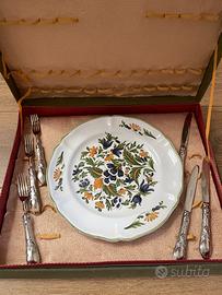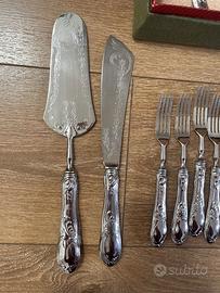 Elegante servizio di posate da dolce, con manici d’argento 800 e coltelli lama Solingen. - set completo per dessert da 12 persone - include paletta e coltello per torte - include piatto da portata Solo i manici sono d’argento e riportano la punzonatura 800.