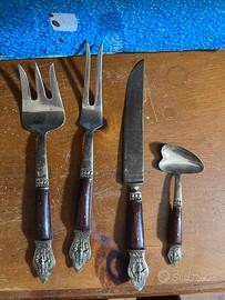 Posate da tavola in metallo con manico in legno definito, sono da pulire siccome son state molto tempo in una taverna. 10 forchette, 14 coltello, 6 cucchiai, 9 cucchiaini da dolce, 1 coltello grosso, 2 forchette per il pesce, e un versa zucchero PREZZO TRATTABILE
