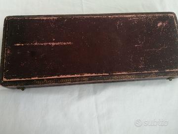 La scatola è strutturalmente sana con usura minore, sfregamento verso l'esterno. Il tessuto interno è usurato. Entrambe le cerniere funzionano bene; la scatola si apre facilmente e si chiude comodamente.