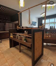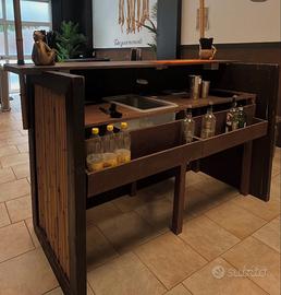 Cocktail station in bamboo con struttura in legno scuro, luci