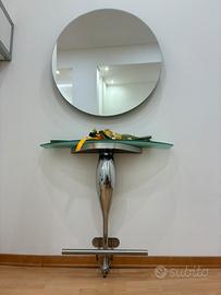 -Specchiera tonda con mensola in vetro illuminata struttura in metallo lavorato