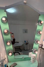 Postazione make-up con poltrona in pelle,specchiera con lampadine incorporate a luce calda e con possibilità di aumentare o diminuire il grado di luminosità.