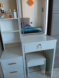 Vendo postazione make up in buone condizioni, 3 cassetti piccoli e uno grande con chiave in più lo specchio oltre che ad avere la luce led touch si apre e dentro ci sono altre mensole oltre alle 3 a vista. prezzo leggermente trattabile Ritiro a mano