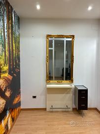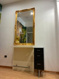 •Specchiera con cornice in stile barocco rivisitato, completa di mensola da lavoro in legno chiaro beige inclusa di portaphon (valore €1.200,00)