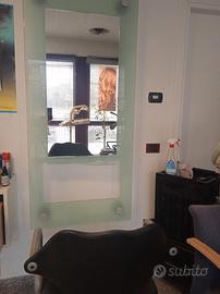 Vendo postazione a muro in vetro, mensola rotta, poggiapiedi e poltrona in regalo. Smontaggio e trasporto a carico dell' acquirente.