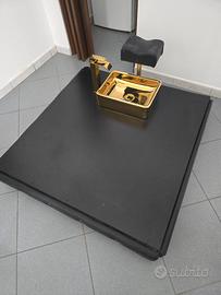 Vendo come da titolo una postazione Pedicure per centro estetico, la postazione è compresa di lavandino, poggia piedi e rubinetto. Completamente realizzata a mano da un falegname con dettagli in finta pelle con punti luce incastonati.