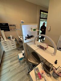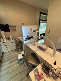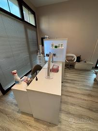 Vendo elegante postazione per nail artist, ideale per centri estetici o uso professionale. La struttura è moderna, di colore bianco, con divisorio centrale e ripiani integrati per organizzare smalti, gel e prodotti.