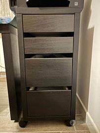 Postazione studio/ufficio Ikea completa di scrivania con “L” estraibile, cassettiera e poltrona in similpelle, tutto pari al nuovo, colore marrone/nero e nero. Si vende solo tutto insieme, vero affare.