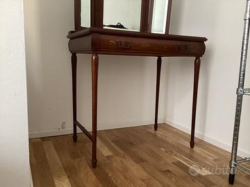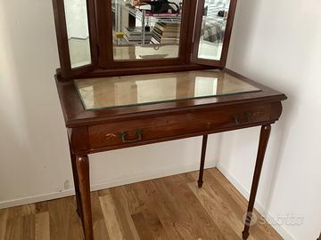 Vanity table boudoir in vero legno, antico ma in condizioni buone, mancate un asta intermezza tra due delle quattro gambe del tavolo ma comunque non incide sulla stabilità del tavolo.