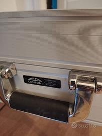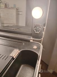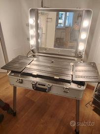 Vendo postazione trucco professionale Cantoni, modello con gambe telescopiche regolabili, specchio con luci integrate, presa di corrente e valigia rigida richiudibile. Ideale per truccatori, parrucchieri, fotografi e make-up artist, perfetta per set fotografici, eventi o uso in salone.