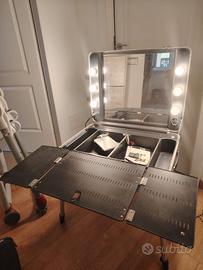 Vendo postazione trucco professionale Cantoni, modello con gambe telescopiche regolabili, specchio con luci integrate, presa di corrente e valigia rigida richiudibile. Ideale per truccatori, parrucchieri, fotografi e make-up artist, perfetta per set fotografici, eventi o uso in salone. Caratteristiche principali: Marca: Cantoni, made in Italy Gambe telescopiche regolabili in altezza Specchio professionale con luci LED integrate (luce naturale, uniforme e regolabile) Valigia in alluminio robusta, facile da trasportare Presa di corrente integrata e interruttore Buonissimo stato, usata pochissimo. La valigia nasce come trolley ma le ruote nel tempo si sono deteriorate e pertanto al momento non sono funzionanti. Prezzo: 320 € Consegna: ritiro a mano o spedizione a carico dell’acquirente