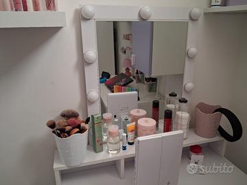 vendo postazione trucco come in foto , ha solo un piccolo difetto ma per il resto è in buone condizioni , con luci con identità regolabile