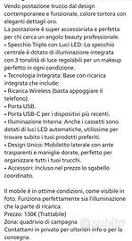 ✨ Bellissima Postazione Trucco Moderna con Specchio LED ✨ Vendo postazione trucco dal design contemporaneo e funzionale, colore tortora con eleganti dettagli oro. La postazione è super accessoriata e perfetta per chi cerca un angolo beauty professionale. • Specchio Triplo con Luci LED: Lo specchio centrale è dotato di illuminazione integrata con 3 tonalità di luce regolabili per un makeup perfetto in ogni condizione. • Tecnologia Integrata: Base con ricarica integrata che include: • Ricarica Wireless (basta appoggiare il telefono). • Porta USB. • Porta USB-C per i dispositivi più recenti. • Illuminazione Interna: Anche i cassetti sono dotati di luci LED automatiche, utilissime per trovare subito i tuoi prodotti preferiti. • Design Unico: Mobiletto laterale con ante trasparenti e maniglie dorate, perfetto per organizzare tutti i tuoi trucchi. • Accessori: Incluso nel prezzo lo sgabello coordinato. Il mobile è in ottime condizioni, come visibile in foto. Funziona perfettamente sia l'illuminazione che la parte di ricarica. Prezzo: 130€ (Trattabile) Zona: quadrivio di campagna Contattami in privato per ulteriori info o per la consegna.