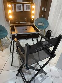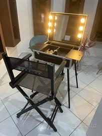 postazione trucco trolley con specchio e sei punti luce, presa di corrente, cavo di alimentazione, piano di appoggio laterale destro, posizionabile anche su lato sinistro. Corredata di 5 gambe removibili con chiusura telescopica.