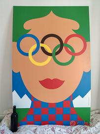 Stampa su pannello plastico spessore 3mm. Dimensione 140 x 90 cm. Si veda la bottiglia di vino come riferimento. È parecchio grande! Design Olimpia Zagnoli per le Olympic family lounges. Sono presenti dei piccoli buchi per l'affissione ai muri delle venues, dettaglio in una foto. meglio consegna a mano data la dimensione, per spedizione sentiamoci direttamente per capire eventi costi e gli imballaggi.