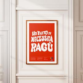Con questo poster senti già il profumo del ragù che borbotta sul fuoco. È una celebrazione del “fare di necessità virtù”, trasformata con ironia e gusto in “fare di necessità RAGÙ”. Ogni dettaglio grafico comunica calore, passione e italianità. Perfetto per chi ama l’umorismo intelligente, il cibo che racconta storie, e il design che parla al cuore (e allo stomaco).