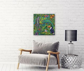 Si tratta di un'illustrazione colorata, in stile vetrata artistica, che raffigura una vivace scena della giungla. L'opera è ricca di una grande varietà di fogliame e presenta quattro animali distinti: un geco viola e verde, un camaleonte verde brillante, un tucano con un becco multicolore e una rana dagli occhi rossi. L'intera immagine è composta da tante piccole forme, riccamente dettagliate, che imitano l'aspetto di un mosaico o di un vetro piombato.