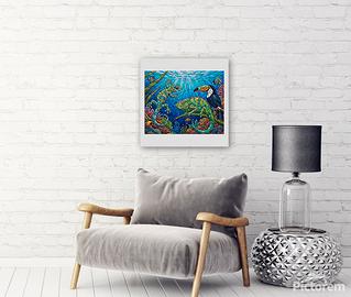 L' opera ci trasporta in un mondo sottomarino, dove gli stessi animali interagiscono in un'ambientazione corallina, illuminata dai raggi di sole che filtrano dall'alto.