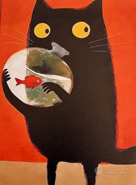 Poster su TELA Gatto simpatico ruba il pesce rosso 30x40.