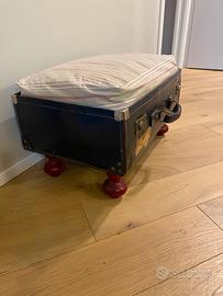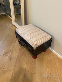 Pouf contenitore ricavato da una valigia d’epoca di colore blu scuro, con con piedini di legno di colore rosso e cuscino rivestito di pregiato tessuto a righe. Prezzo originale in negozio 330 euro.