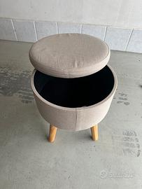 Pouf rotondo in tessuto beige con contenitore interno.