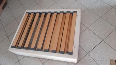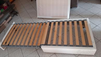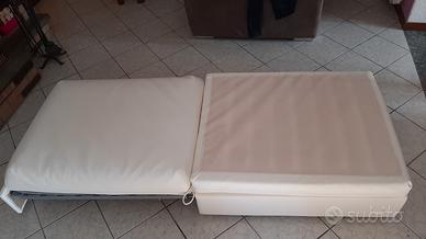 Pouf di pelle che si trasforma in letto singolo, con doghe in legno. Dimensioni da chiuso: 100cm x 78cm, altezza 45cm. In ottime condizioni, usato solo 2 volte, praticamente nuovo.