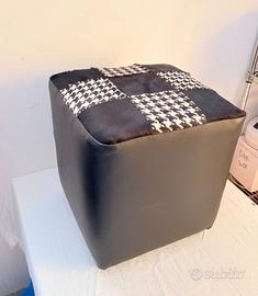 Vendo opouf cubico ideale come seduta aggiuntiva, poggiapiedi o elemento decorativo per un salotto moderno o uno studio elegante. La struttura robusta rivestita in pelle, alternando riquadri neri pieni all'iconica trama pied de poule bianco e nero.