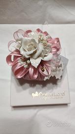 in raso con decorazione nastri nebbiolina e fiori in ceramica Capodimonte, diametro 8 cm. Nuovo con cartellino e scatola originale