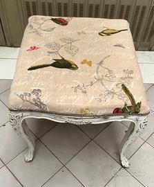 POUF/ SGABELLO IN STILE SHABBY CHIC, ha forme morbide, un po' barocche ed é rivestito con un tessuto canapato con disegni di uccellini e scritte su sfondo ecru. Misure:57x57, h 50