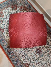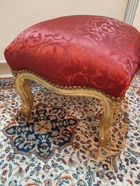 Pouf in foglia oro, seduta imbottita, tessuto in raso colore bordó, stile barocco.