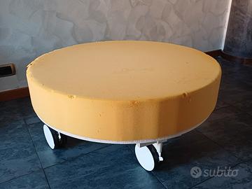 Pouf tondo a 4 ruote fatto artigianalmente diametro di 86 cm altezza 41 circa, in gomma piuma e fondo in legno , da rivestire in tessuto a piacimento....come da foto. Scambio a mano.