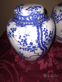 2 poetiches in porcellana con decori blu su fondo ghiaccio