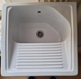 Vendo, come da foto, lavandino per lavanderia comprensivo di mobiletto con n.2 sportelli, piedini regolabili, foro passa tubi. Dimensioni: 55 x 55 x 85 Il lavandino è dotato di piletta e sifone di scarico. Prodotto robusto e ben fatto.