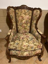Comode poltrone, antiche in stile francese in legno di noce intagliato, con seduta e schienale imbottititi. Sedie molto versatili, perfette per soggiorno o camere da letto.