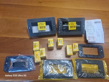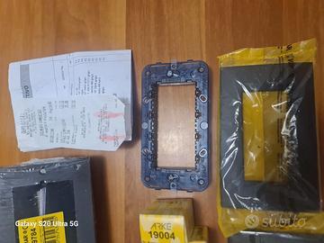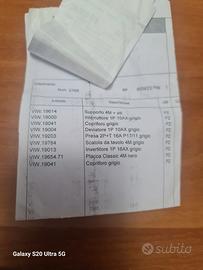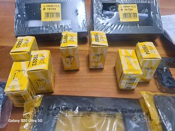 Vendo nuovi pezzi Vimar tra cui interruttori, prese, copriforo, placca, supporto 4m, deviatore, scatola da tavolo come da foto e fattura allegata